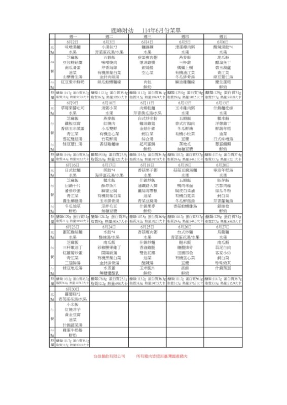 幼兒園114年6月餐點表