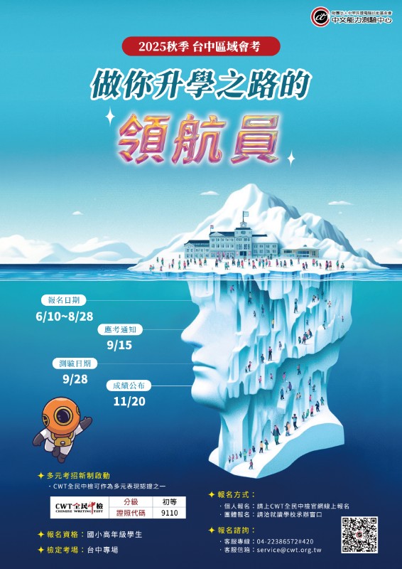 財團法人中華民國電腦技能基金會 2025中文能力測驗中心「秋季臺中區域會考」將於2025年9月28日舉辦。 |