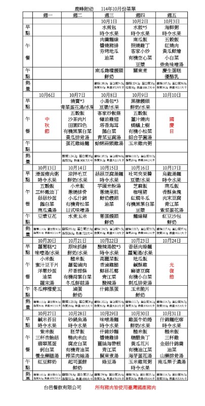 幼兒園114年10月餐點表