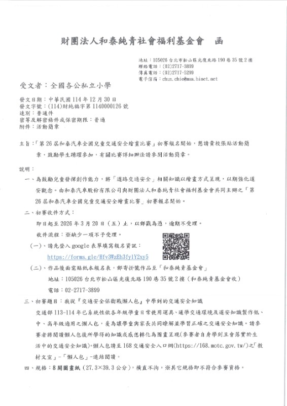 | 標題 | 第26屆和泰汽車全國兒童交通安全繪畫比賽活動資訊 |