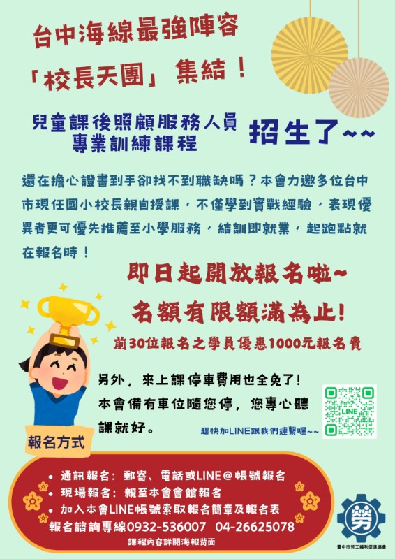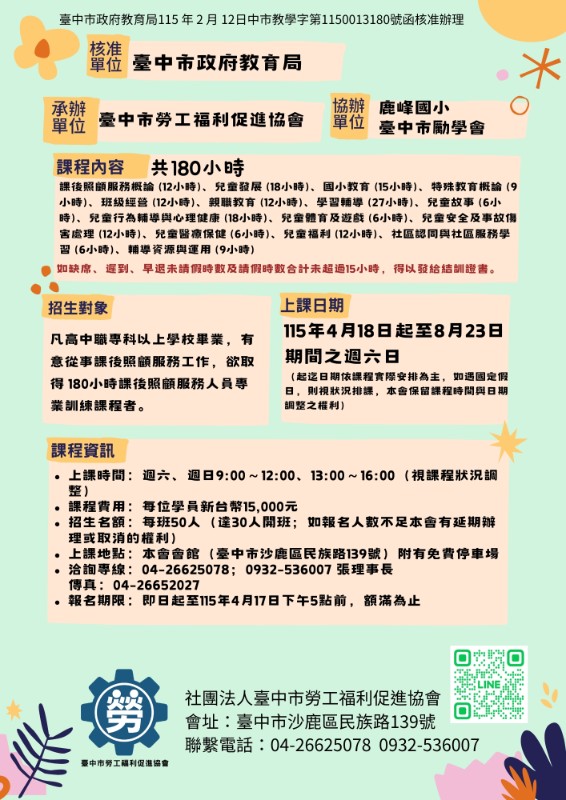 臺中市政府教育局委託社團法人臺中市勞工福利促進協會辦理兒童課後照顧服務人員專業訓練課程職前訓練,協助公告周知。 詳如附件
