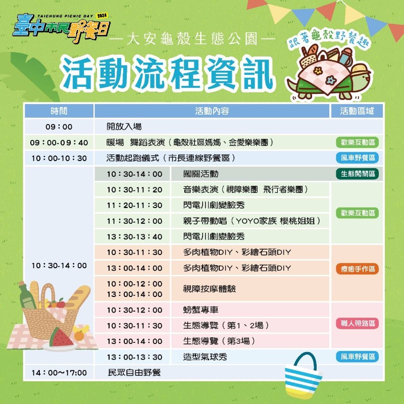 台中市政府勞工局及大安區公所將於11月3日攜手在大安龜殼生態公園推出「台中市民野餐日-跟著龜殼野餐趣」活動延期至11/10日,相關活動內容可參閱文宣海報。