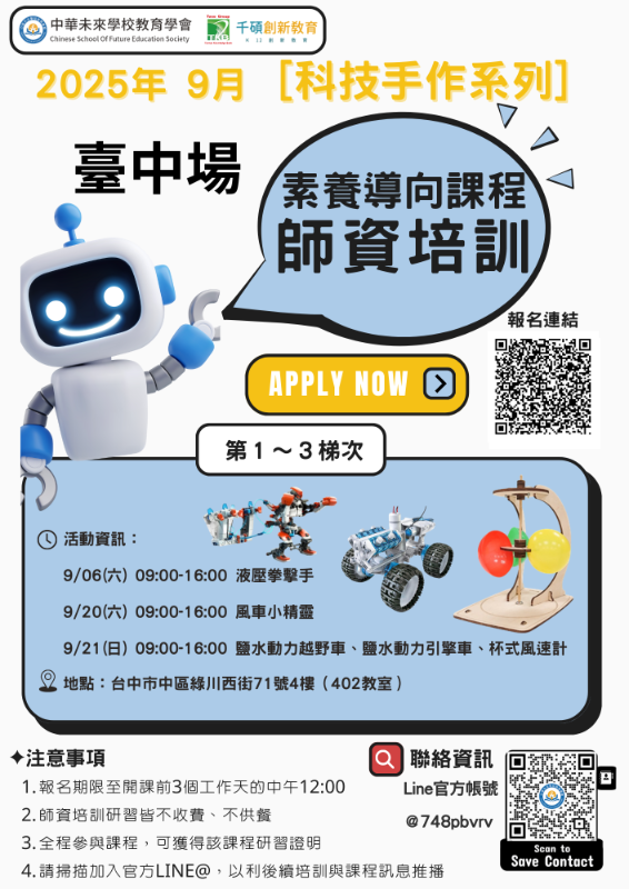 為增進教師跨領域專業知能,提升對 STEAM 教育之整合運用能力,並強化教學現場實務應用,本會特辦理「科技手作師資培訓課程」。 |