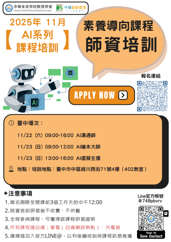 本系列研習規劃培訓三領域,包含AI系列領域:「AI溝通師」、「AI繪本大師」、「AI虛擬主播」,職涯試探領域:中醫、理財,科技素養領域:科技手作,以協助教師精進多元素養教學能力,並拓展教學應用成效,詳見海報資訊。 |
