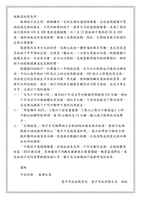 考量本學年度各校學生健康檢查辦理完畢,為提醒家長視力複診對學生之重要性,並提供家長正確視力保健宣導觀念,規劃「致家長一封信」。