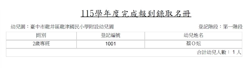 臺中市龍井區龍津國小附設幼兒園115學年度第一階段招生完成報到錄取名冊