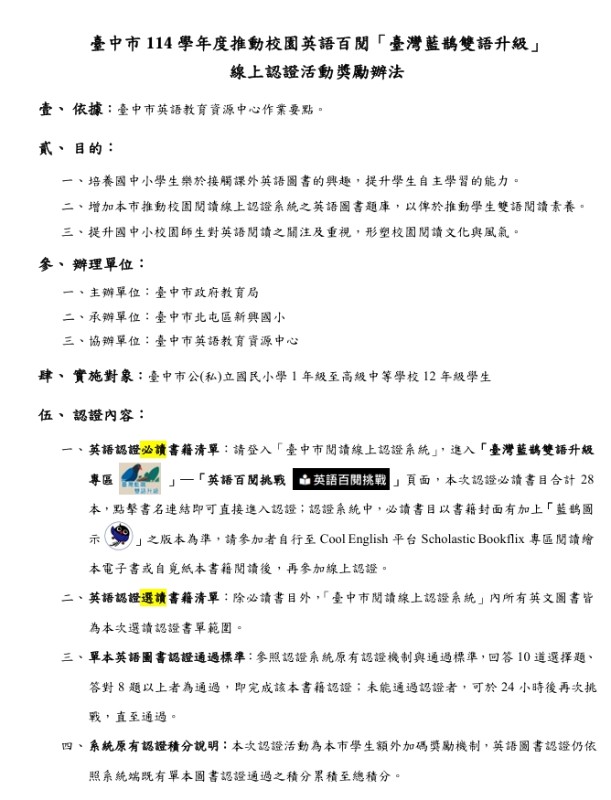 轉知:本市114學年度推動校園英語百閱「臺灣藍鵲雙語升級」線上認證活動獎勵辦法 |