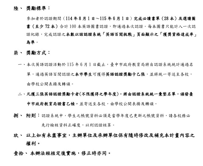 為培養學生樂於接觸英語圖書,並藉以提升其閱讀及英語自主學習能力,本局辦理旨揭獎勵辦法,於認證期間(114年8月1日起至115年6月1日)完成100本英語圖書認證(28本為必讀書單、72本為選讀圖書),即通過本次認證,予以頒發認證獎勵卡乙張,相關認證內容、獎勵標準及獎勵方式請詳閱旨揭辦法內容。 |