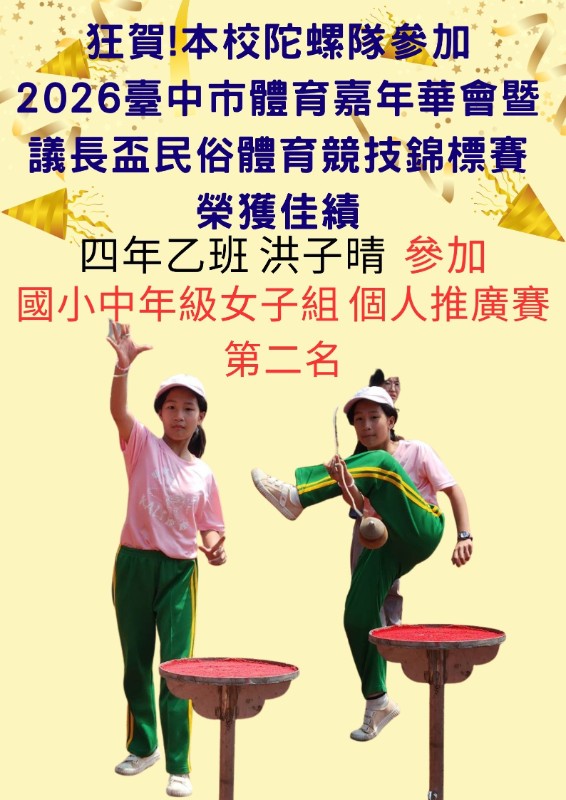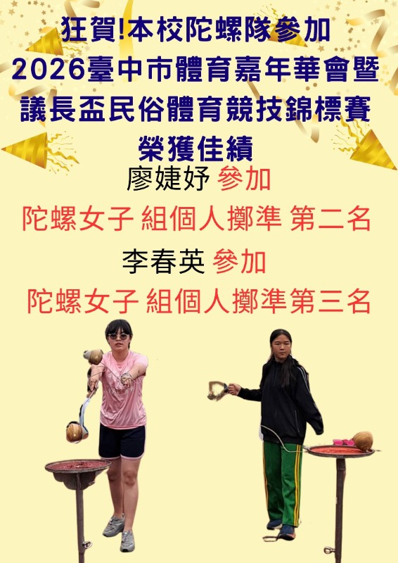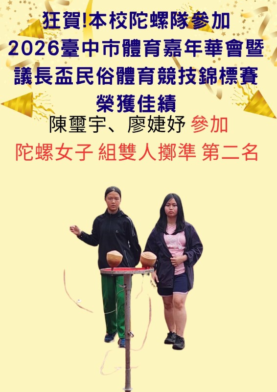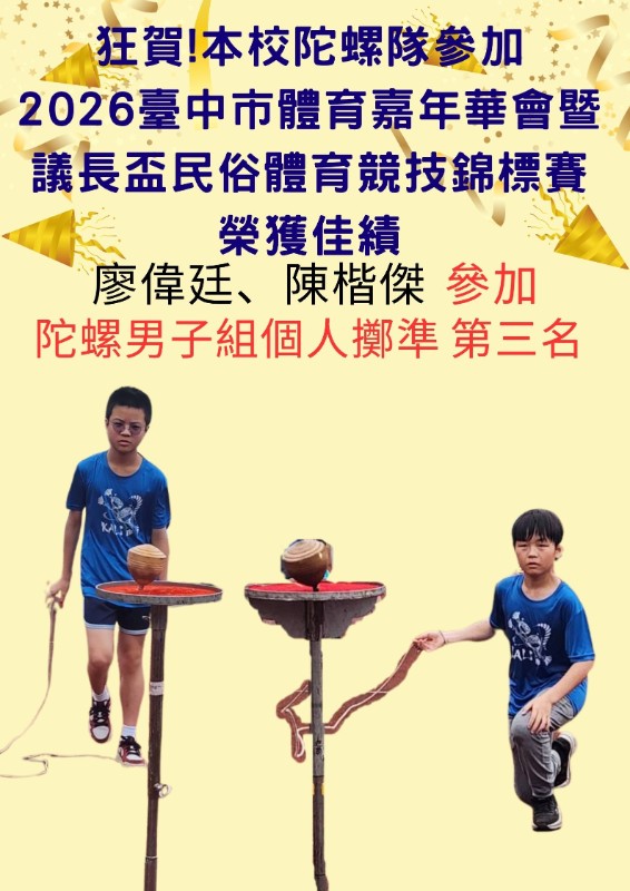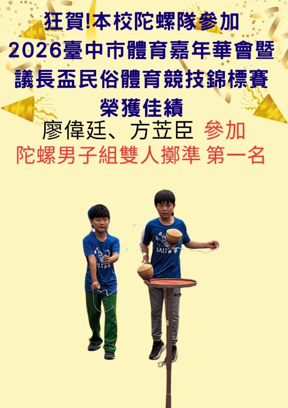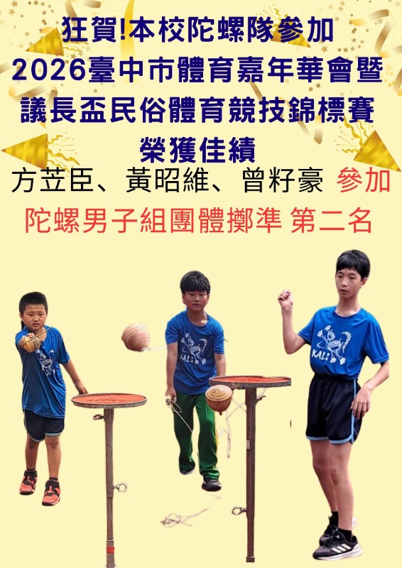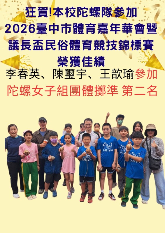 狂賀!!本校陀螺隊參加2026臺中市體育嘉年華會暨議長盃民俗體育競技錦標賽榮獲多項獎項~