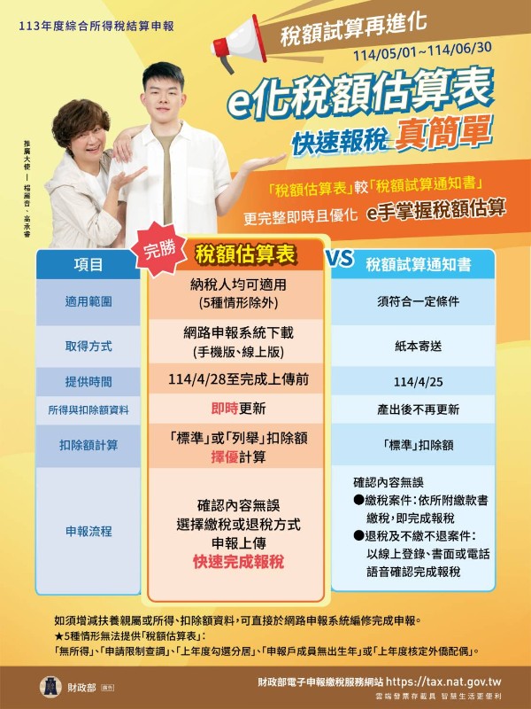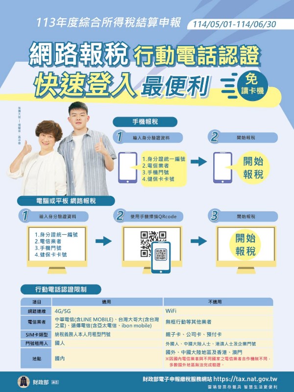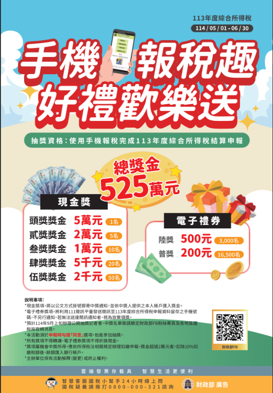 一、113年度綜合所得稅申報期間自114年5月1日起至同年6月30日止,注意事項請參閱: (一)113年度綜合所得稅申報期間自114年5月1日至同年6月30日止!請多加利用手機報稅,下載「稅額估算表」確認內容無誤後,選擇繳(退)稅方式及申報上傳,快速完成報稅。 (二)「手機報稅趣 好禮歡樂送」:頭獎獎金新臺幣5萬元,獎項豐富,歡迎多加使用手機報稅,快速又方便,還可參加抽奬喔! (三)手機也能申報綜合所得稅喔!只要輸入納稅義務人手機門號、身分證統一編號、健保卡卡號及電信業者等資料進行行動電話認證,在家即可完成申報,如須增減扶養親屬或所得、扣除額資料,也可以透過系統編修完成申報。 (四)113年度每人基本生活所需之費用金額調增為21萬元,114年5至6月申報綜合所得稅時適用。 (五)113年度納稅義務人6歲以下子女之幼兒學前特別扣除額,第1名子女扣除15萬元,第2名及以上每名子女扣除22.5萬元。 (六)113年度納稅義務人、配偶及受扶養直系親屬無自有房屋而需租屋自住,其租金可列報房屋租金支出特別扣除額,上限為18萬元,並訂有排富規定。 (七)想要最快拿到綜合所得稅退稅款嗎?請於綜合所得稅申報期間(114年5月1日至同年6月30日),透過網路申報(含手機報稅)選擇存款帳戶退稅,114年7月31日就能自動入帳。 (八)申報戶成員如有直接或間接投資低稅負區關係企業,或以低稅負區關係企業股份或資本額為信託財產,應檢視是否適用個人CFC制度,並依規定格式揭露相關資訊及檢附證明文件,於綜合所得稅申報期間辦理申報。 (九)如有需至國稅局臨櫃報稅,請多利用網路或電話預約報稅服務功能,減少現場等候時間,網路預約請至財政部中區國稅局官網,電話預約請撥打免費服務電話0800-000321。 (十)如有國稅相關問題,請多利用智慧客服「國稅小幫手」,24小時為您提供線上稅務諮詢。 二、凡設籍於本所轄區(臺中市大里區、太平區、霧峰區及烏日區)之納稅義務人,使用手機完成113年度綜合所得稅結算申報,可至本所第一辦公室,憑手機報稅完成申報截圖畫面或收執聯,兌換優惠券1張,詳請請見「手機報稅享優惠」DM。 三、檢附「報稅不費力 手機就搞定」、「網路報稅行動電話認證 快速登入最便利」、「e化稅額估算表 快速報稅真簡單」、「手機報稅趣 好禮歡樂送」、「手機報稅享優惠」、「房屋租金支出變特別 租屋減稅更直接」及「調高扣除金額減負擔 育兒增幸福」DM。 四、更多報稅訊息,請至財政部中區國稅局官網、「中區國稅局稅務e吉棒」FB及IG粉絲專頁、「影音頻道中區國稅局」Youtube頻道,隨時掌握最新稅務資訊。