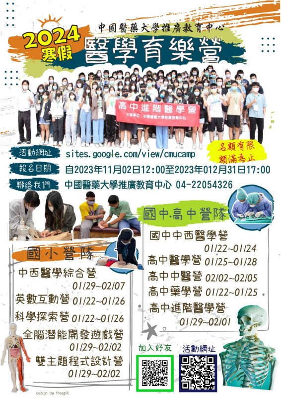| 標題 | 中國醫藥大學推廣教育中心於113年1月22日到113年2月7日寒假期間辦理『高中、國中、國小醫學營及各類主題營隊』 |