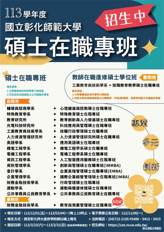 本招生資訊敬請協助公告於貴機關LED字幕機(跑馬燈)或電視牆,公告內容:「113學年度國立彰化師範大學碩士在職專班招生中!報名自即日起至113年3月4日晚上10時止,更多招生訊息請至彰化師大進修學院官網查詢」。 |