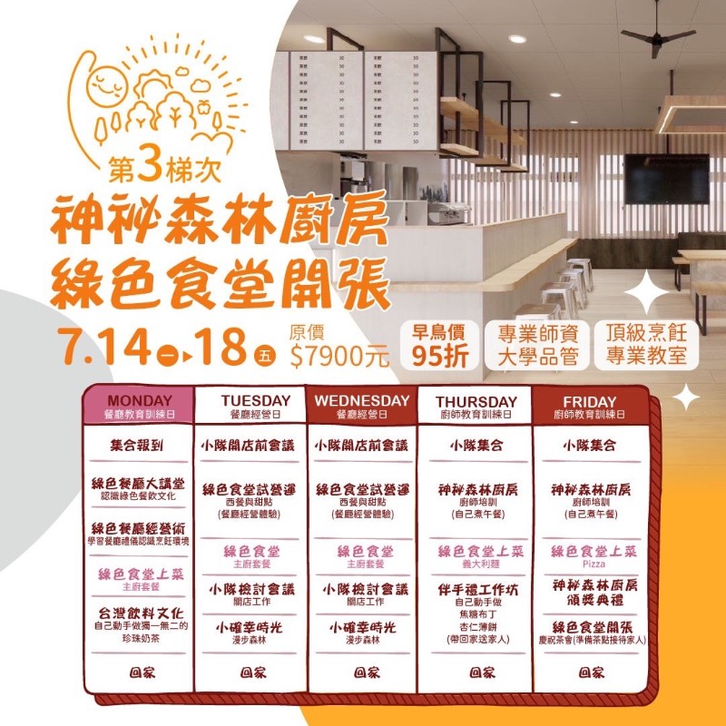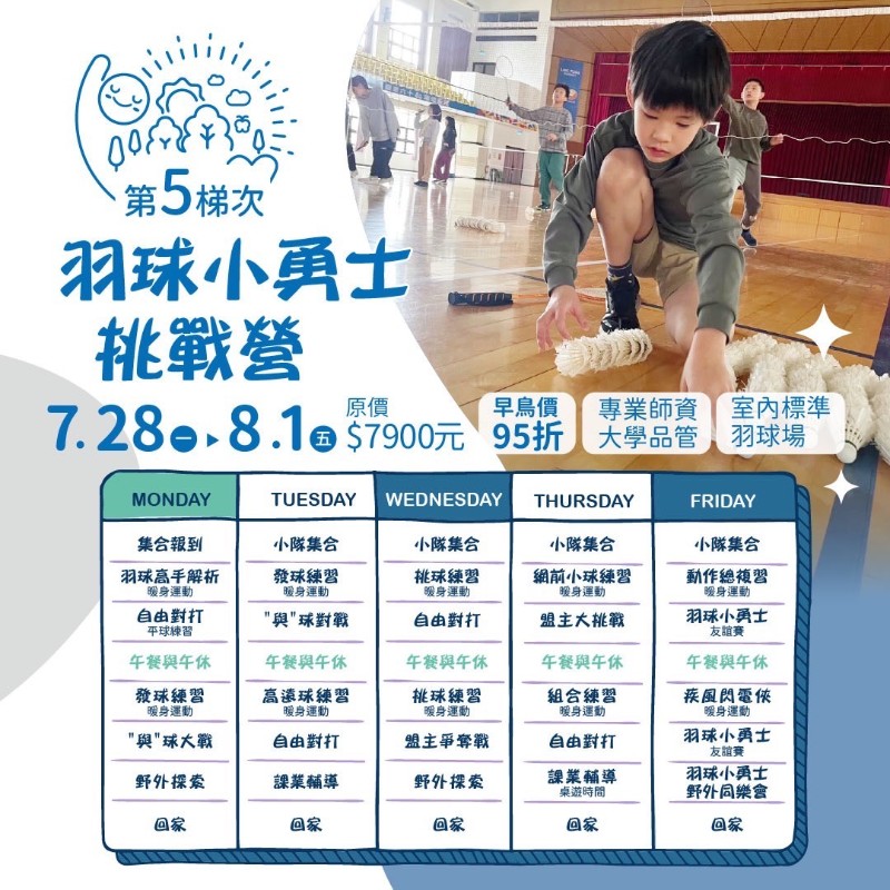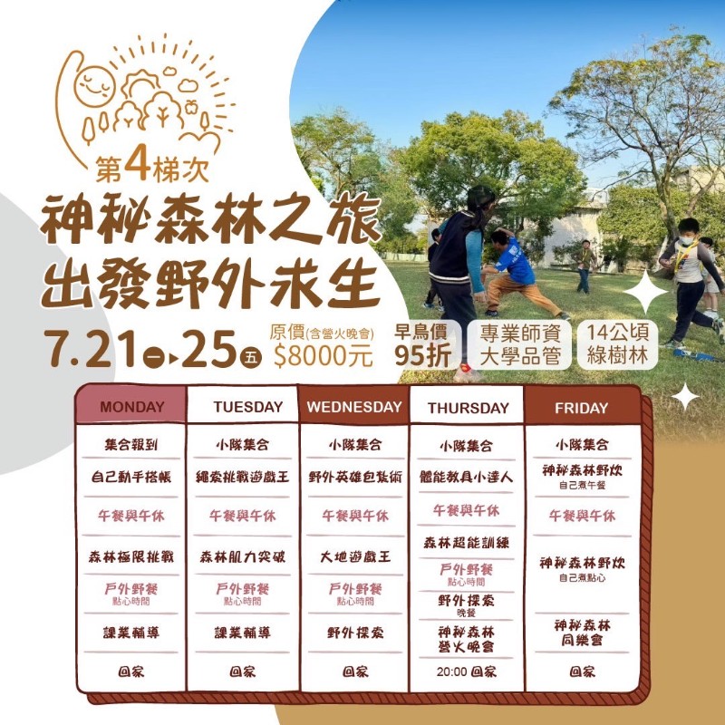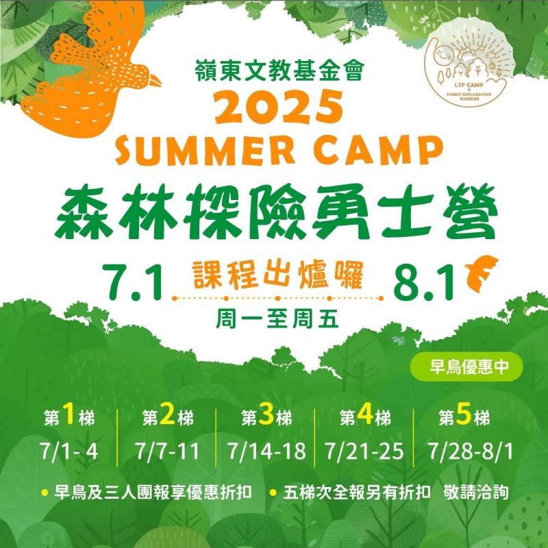 5.早鳥專屬優惠:即刻起至05/18以前完成報名繳費,即享95折優惠價唷 6.詳細課程內容及優惠方案,可直接加Line私訊詢問 7.報名表單直接點入連結即可報名 2025‧LTF夏令營‧森林探險勇士營‧報名表: https://docs.google.com/forms/d/1u0zK0HKUT2mG9qBT1hFFRX9ku22S1AOstL7AJ6nOoqQ/viewform 8.課程聯絡人LINE: jecho0511 誠摯邀請和我一樣用心陪伴孩子成長的你們,加入我們森林探險勇士營的行列,讓孩子與我們一起變的堅強、快樂、頭好壯壯喔