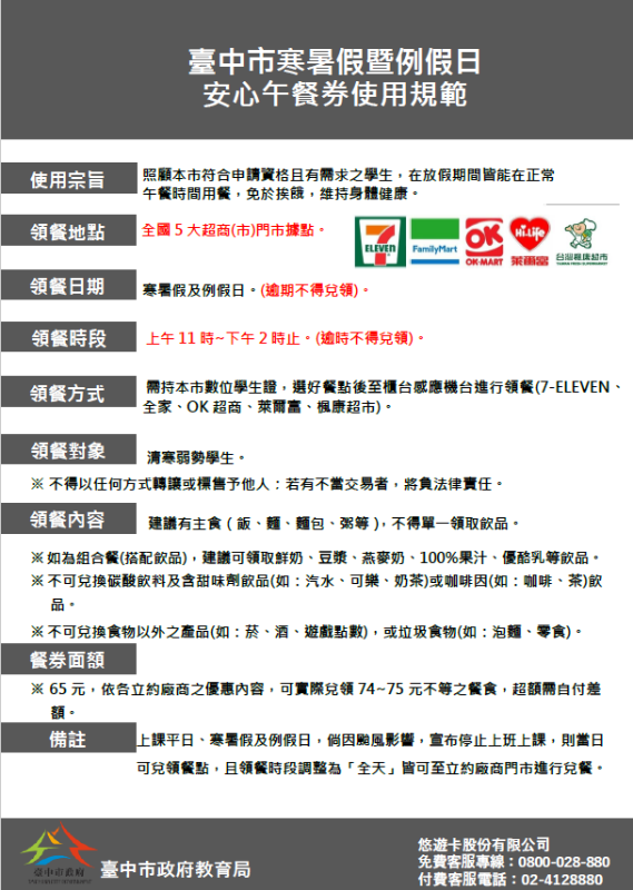 115年寒假暨114學年度第2學期例假日 【安心午餐券領餐內容】及使用規範