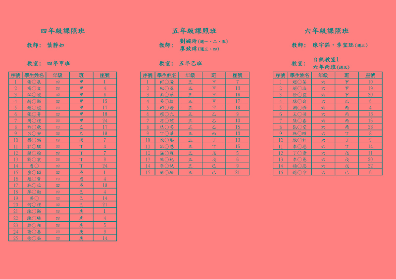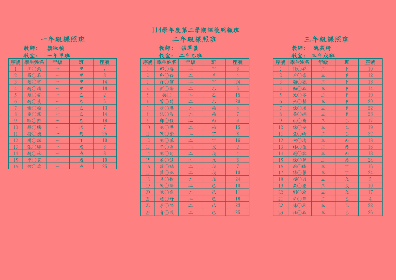 114學年度第二學期課後照顧名單-開課日期為2/23(一)開學日當天