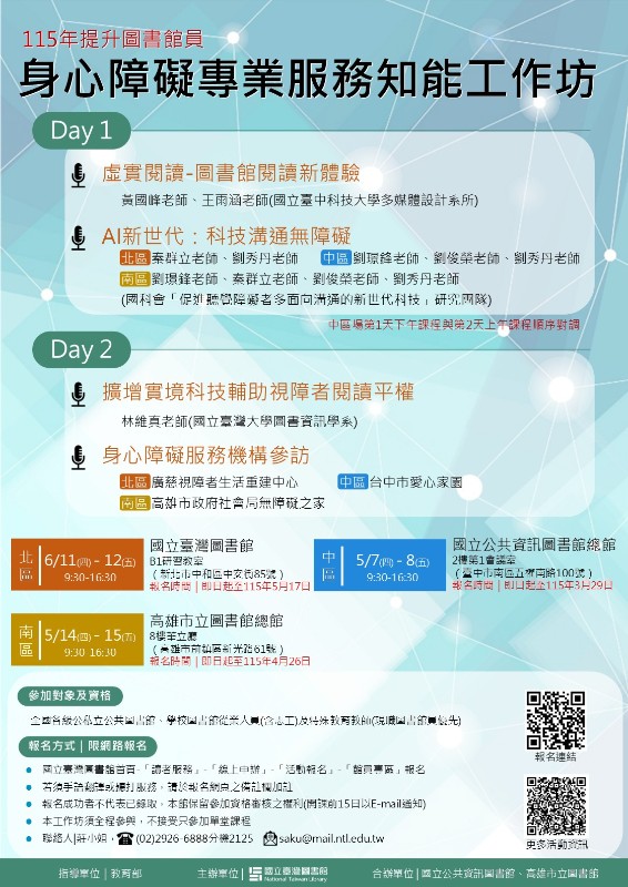 一、依據國立臺灣圖書館(以下簡稱該館)115年1月16日圖採字第11502000111號函辦理。 二、該館前經教育部103年11月28日臺教社(四)字第1030174869號函指定為專責圖書館,負責落實及推動身心障礙者數位化圖書資源利用服務。為增進全國圖書館員身心障礙服務專業素養,特於本年5-6月間規劃於該館、國立公共資訊圖書館及高雄市立圖書館辦理旨揭工作坊。 三、本研習參加對象以全國各級公私立公共圖書館、學校圖書館從業人員(含志工)及特殊教育教師為主(現職圖書館員優先),有意參加者請於各場次報名期限截止前,逕至該館入口網-「讀者服務」-「線上申辦」-「活動報名」-「館員專區」網頁(https://reurl.cc/r3Y6p4)報名。 四、本工作坊須全程參與,不接受只參加單堂課程。因活動記錄需求,課程中工作人員會進行照片拍攝或錄影,其影像供主辦單位、合辦單位日後教育推廣及成果紀錄使用,報名視同同意拍攝。 五、課程詳細資訊歡迎參閱計畫書或逕至該館網站最新消息(https://www.ntl.edu.tw)項下查詢下載。 六、檢附工作坊實施計畫書及海報各1份供參。 七、本案如有疑義逕洽承辦人莊易儒,電話:02-2926-6888 分機2125。