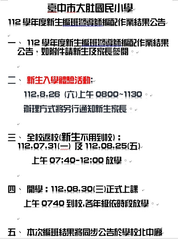 | 標題 | 臺中巿大肚國民小學-112學年度本市公私立國民小學新生暨三、五年級常態編班結果-更新 |