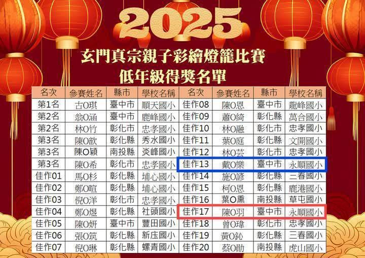 賀!一年乙班 戴丞樂 參加2025玄門真宗親子彩繪燈籠比賽 榮獲 低年級組 佳作