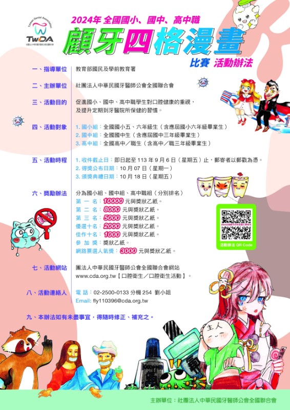 轉知社團法人中華民國牙醫師公會全國聯合會辦理「2024年全國國小、國中、高中職顧牙四格漫畫比賽」活動 |
