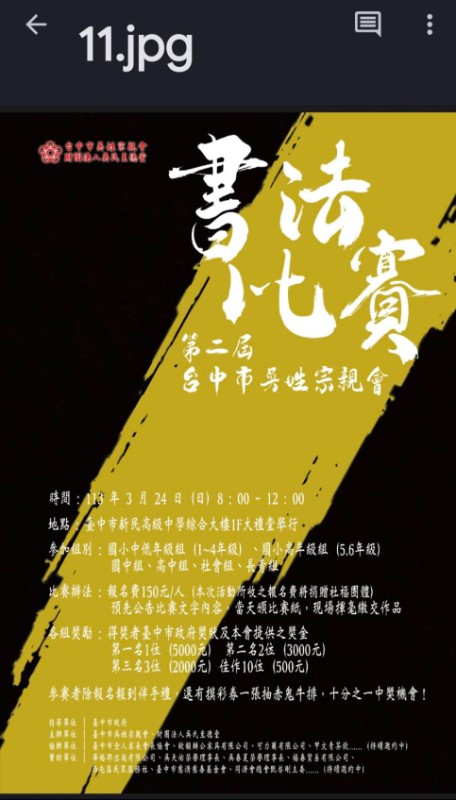 一、依據台中巿吳姓宗親會112年10月28日中吳城字第112016號函辧理。二、比賽資訊(一)參加組別:國小中低年級組(1~4 年級)、國小高年級組(5.6 年級)、國中組、高中組、社會組、長青組(共六組) 。(二)比賽日期:民國 113 年 3 月 24 日(星期日)上午8:30-12:00(三)比賽地點:臺中市新民高級中學綜合大樓 1 樓大禮堂(四)報名網址:https://taichung-wu.org三、檢附活動計畫、海報各一份。四、若有其他疑問,請電洽本案聯絡窗口:台中巿吳姓宗親會吳先生0935-366991。