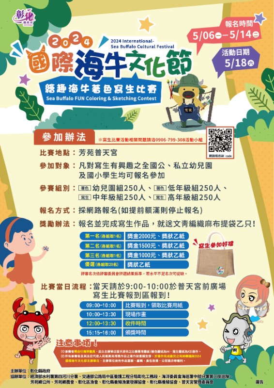 一、依據彰化縣政府113年4月24日府農漁字第1130155394號書函辦理。二、參加辦法說明如下:(一)參加對象:凡對寫生有興趣之全國公、私立幼兒園及國小學生均可報名參加。(二)報名時間:自113年5月6日(星期一)至5月14日(星期二),採網路報名(如提前額滿則停止報名)。(三)活動時間:113年5月18日(星期六)上午9時至下午4時。(四)比賽地點:芳苑普天宮(彰化縣芳苑鄉芳漢路芳二段161巷100號)。三、檢附寫生比賽海報1份。四、若有相關問題請逕洽活動小組承辦人,電話:0906-799308。