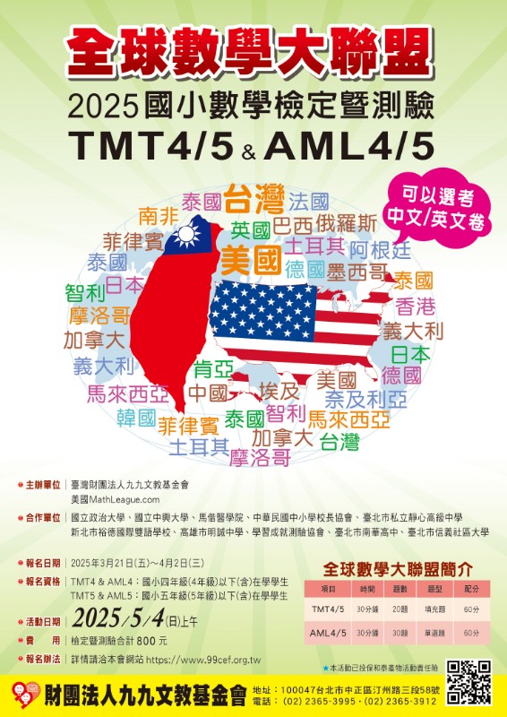 轉知:全球數學大聯盟 2025國小數學檢定暨測驗 TMT4/5 & AML4/5 |