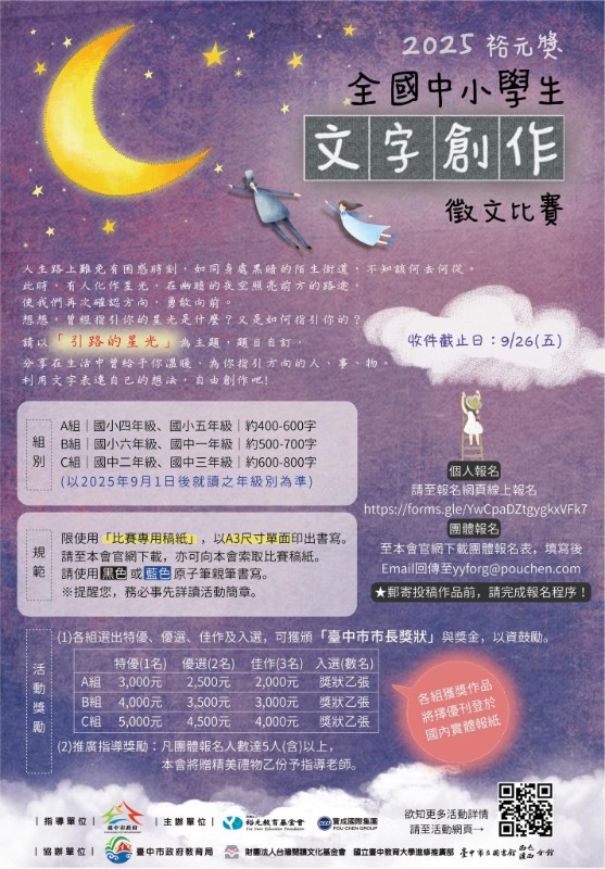 轉知:國立臺中教育大學協助轉發財團法人裕元教育基金會辦理之「2025裕元獎-全國中小學生文字創作徵件比賽」 |