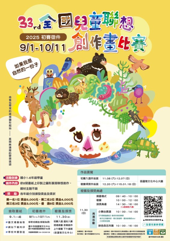 離島學童作品通過初賽評審,並經通知准予參與複賽,且於複賽當日確實報到者,學童及其陪同師長一名,覈實支付來回經濟艙機票或船票。(搭乘日期需為複賽日期前後三天內114/11/28~114/12/2)另檢附活動海報電子檔1份供參,敬請協助於網站、電視牆等管道刊登宣傳,以利活動推廣。活動辦法詳全國兒童聯想創作畫比賽網站(https://childdrawings.huludun.taichung.gov.tw/index.asp)。 |