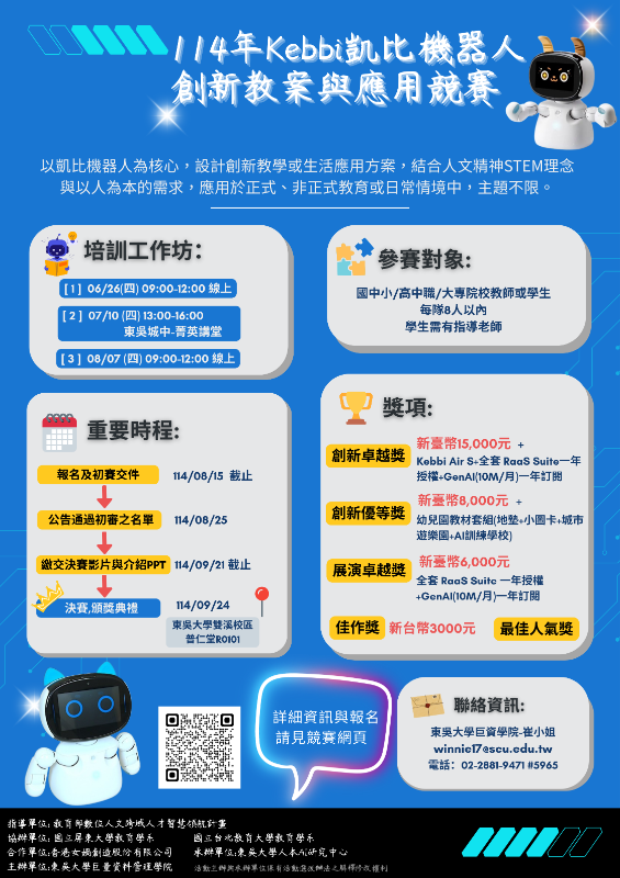 為促進跨領域合作,增進教育與科技創新,東吳大學巨量資料管理學院主辦「STEM人文跨域與AI應用競賽—114年Kebbi凱比機器人創新教案與應用競賽」,歡迎各大專院校及高中職學生與教師踴躍參加,展現創新設計與實踐能力,詳情請參閱附件,報名:https://reurl.cc/7KRMzy。 |