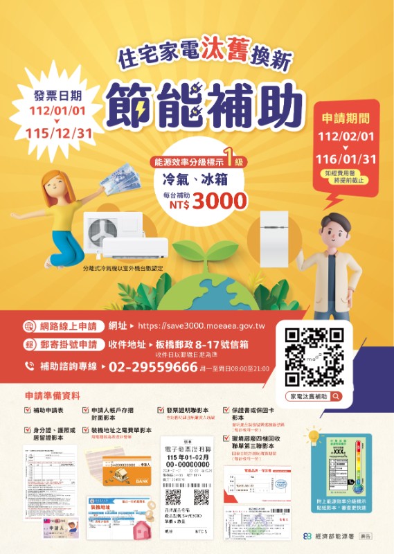 檢送經濟部115年度「住宅家電汰舊換新節能補助」海報及宣傳標語電子檔各1份,請協助宣導曝光,以鼓勵民眾踴躍汰換家電並申請補助