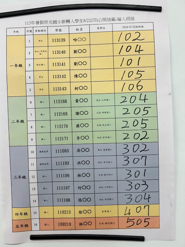 113年暑假轉入生班級抽籤結果如圖: