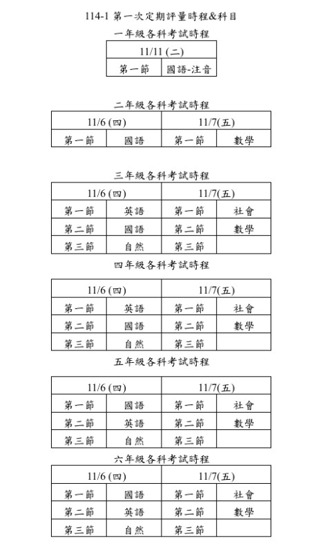 114-1 第一次定期評量考科時程公告