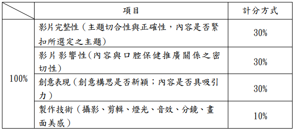 鼓勵校內師生踴躍報名參加 若有興趣的老師或學生可以與健康中心護理師聯絡 一起發想創意劇本、拍攝方式 詳細比賽辦法-潔牙微電影比賽辦法 一、微電影主題(至少包含其中 1 項) 二、微電影內容 三、活動時間及繳件期限: 四、評分方式: