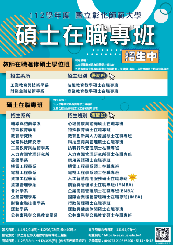 轉知國立彰化師範大學「112學年度碩士在職專班」招生資訊及海報,請查照。 |