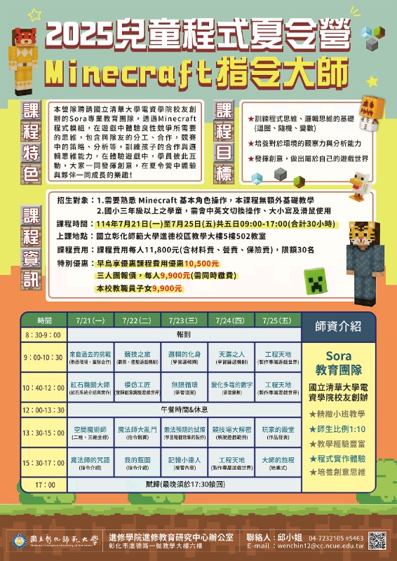 標題 轉知:國立彰化師範大學修學院推廣教育「【2025兒童程式夏令營】Minecraft 指令大師」、「【2025兒童程式夏令營】App Inventor 2 基礎程式證照班」招生簡章
