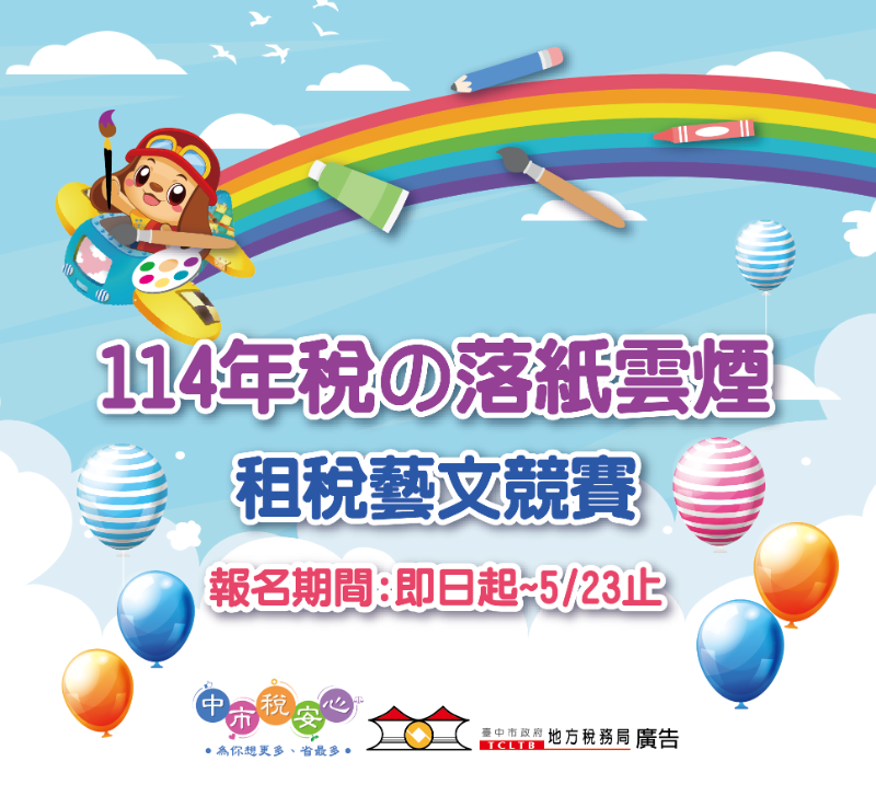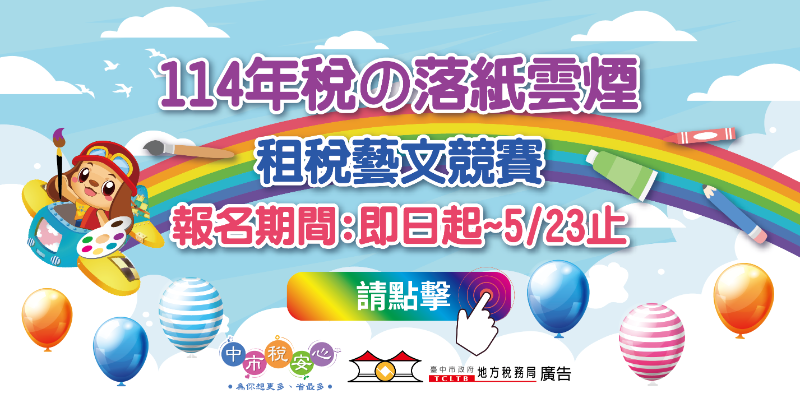 臉書貼文:臺中市「稅の落紙雲煙」租稅藝文競賽報名至5月23日止,活動詳情請至臺中市政府地方稅務局網站查詢! |