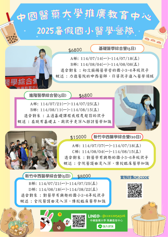 轉知:中國醫藥大學推廣教育中心辦理「2025暑假國小醫學營隊」招生資訊。 |