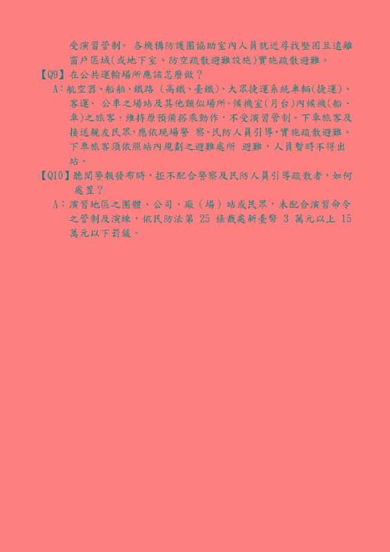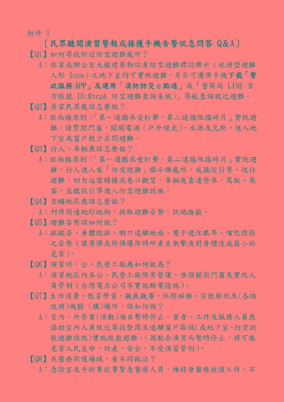 主旨:臺中市2025城鎮韌性(防空)演習宣導執行計畫。 說明: 一、 臺中市2025城鎮韌性(防空)演習訂於114年7月15日(星期二)13時30分至14時,採有預警、分區同時段方式,實施30分鐘警報傳遞與發放、疏散避難、交通及其他必要管制等實作演練。 二、 演習警報發放後,各级政府機關、學校、團體、公司、廠(場)站及民眾應配合演習管制,人、車一律按規定接受警察及民防人員引導,就近進入防空避難設施進行防空疏散避難,或依地形、地物切實掩蔽;若周邊無防空疏散避難設施,或無法及時進入防空疏散避難設施、地下室時,則就近尋找堅固且遠離窗戶之區域,依「兩牆原則」實施避難。 三、 公、民營工廠照常營運,但須關閉門窗及實施人員管制(臺灣電力公司不實施斷電措施)。 四、 醫療照護、公共運輸、生活消費、教育學習、觀展觀賽、休閒娛樂、宗教祭祀及機關(構),請依行政院112年6月29日函頒「各場域防空疏散避難指引」主動協助民眾實施疏散避難。 五、 各機場、港口之飛機、船舶、鐵路、高(快)速鐵、公路及捷運車輛,均照常起降、靠離與行駛,其下飛機(船舶、車輛)旅客、接送親友與下交流道車輛,仍須實施防空疏散避難。 六、 各重點驗證區(本市清水、沙鹿及梧棲區)轄內防空疏散避難設施之所有人(管理委員會、保全或住戶),聽聞防空警報應主動開啟地下室車道之鐵捲門(柵欄),供周邊民眾就近實施避難;車輛(駕駛、乘員),則聽從警察及民防執勤人員引導,就近進入防空疏散避難設施。 七、 演習地區之團體、公司、廠(場)站或民眾,未依民防法第21條、防空演習實施辦法第12條規定,配合演習命令之管制及演練,依民防法第25條處新臺幣3萬元以上15萬元以下罰鍰。 八、 演習中,如遇真實空襲狀況,演習立即停止,另按現行作業規定再行施放緊急警報。