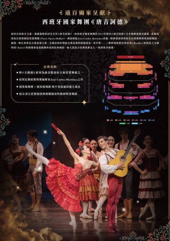 藝文活動為多元藝術的展現,為拓展台灣觀眾的藝文素養與舞蹈藝術之視野,本公司引進與《天鵝湖》並列為最受歡迎的古典芭蕾舞劇之一的《唐吉訶德》,由西班牙最具代表性的「西班牙國家舞團」全本演出。與多數偏向悲劇色彩的故事不同,《唐吉訶德》故事圍繞在唐吉訶德旅途上遇到的一對西班牙戀人的愛情故事,寫實與幻想場景交織出豐富的戲劇層次及充滿節慶的歡快氛圍,加上西班牙國家舞團特有的熱情澎派佛朗明哥風格,是一齣別開生面、熱鬧有趣的國家級芭蕾舞演出!在舞蹈技巧上,《唐吉訶德》也以炫技十足的舞蹈段落與濃厚戲劇張力聞名於世,包括經典大雙人舞中舞者需以高度默契完成連續高難度托舉、旋轉與跳躍,以及女主角獨舞中的「32鞭轉」更是對舞者平衡感、核心力量與心理專注度的極限考驗。誠摯推薦師生前來欣賞,感受既保有古典芭蕾嚴整的結構之美,也流露濃厚地域文化風情的芭蕾舞劇《唐吉訶德》。 |