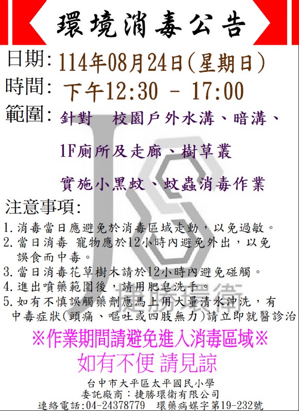 將針對小黑蚊與一般蚊蟲進行專業消毒作業 為確保安全與效果,請配合以下事項: 1.消毒當日避免進入校園消毒區域