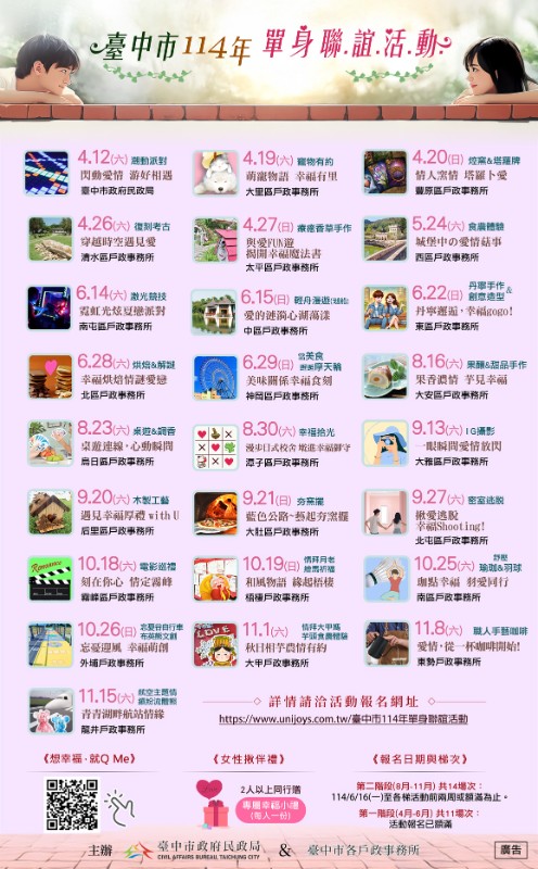 臺中市政府民政局辦理「臺中市114年單身聯誼活動」第二階段場 次於6月16日(星期一)上午8時開放報名,單身同仁踴躍報名參加。