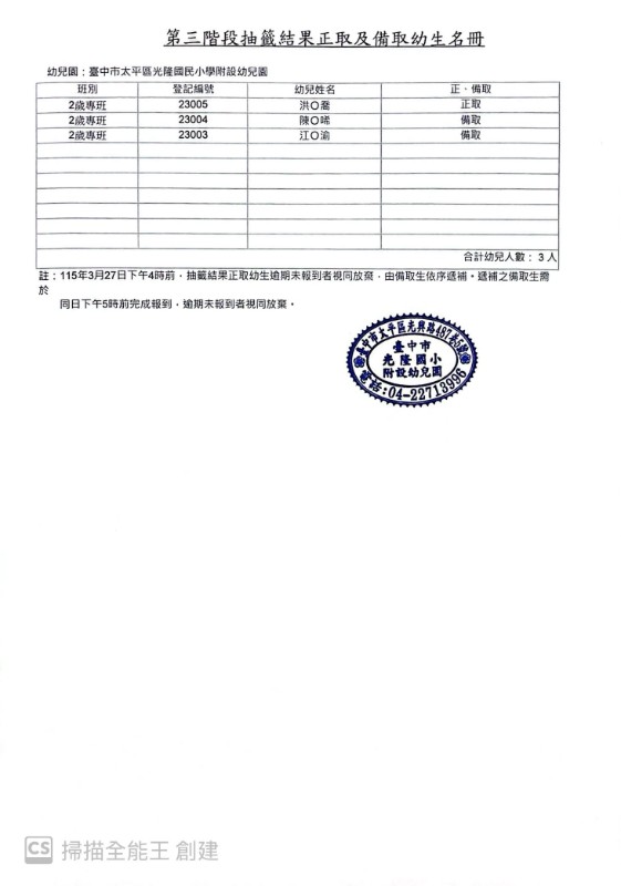 臺中市太平區光隆國小附設幼兒園115學年第三階段正取、備取公告