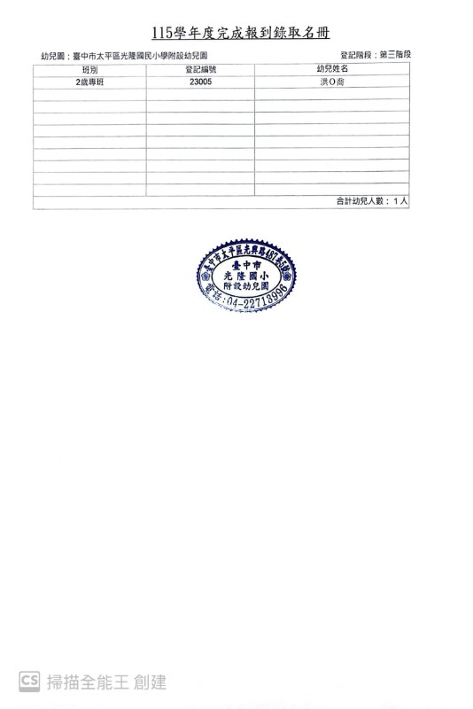 臺中市太平區光隆國小附設幼兒園115學年第三階段報到錄取公告