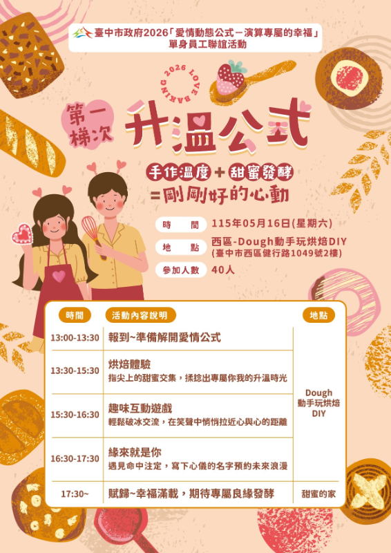 一、為落實本市幸福宜居城市願景,鼓勵單身同仁擴大社交圈並增進情感交流,期能締結良緣並提升婚育率,爰辦理旨揭活動。 二、本年度共辦理四梯次單身員工聯誼活動,第一、二梯次活動 資訊摘要如下,另第三、四梯次相關報名訊息將於下半年再 函轉知: (一)第一梯次:【升溫公式】手作溫度 + 甜蜜發酵 = 剛剛好的心動 1、時間:115年5月16日(星期六)13:00~17:30。 2、地點:西區-Dough動手玩烘焙DIY。 3、辦理方式:手作烘焙--在協力手作專屬甜點時光裡,自然升溫彼此的默契與好感。 4、報名日期:即日起至115年4月17日止。