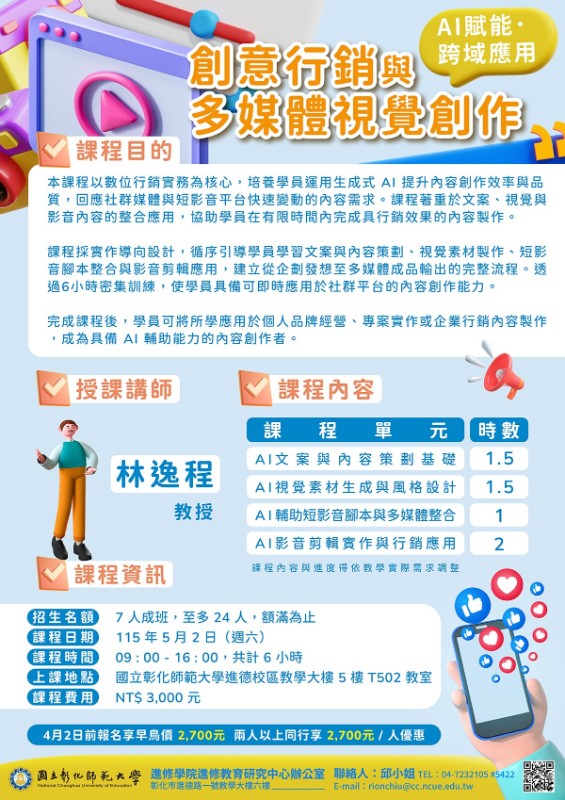 一、 「【AI賦能.跨域應用】創意行銷與多媒體視覺創作」 (一)課程特色:本課程採實作導向,透過 AI 文案策劃、視覺生成、短影音腳本編排及自動化剪輯四階段,在 6 小時內強化學員的數位行銷實務能力,成為能即時產出社群內容的全能創作者。 (二)課程時間:115年5月2日 (週六)09:00-16:00,共計6小時。 (三)課程費用:3,000元,開課前1個月報名享早鳥價2,700元;兩人以上同行每人享2,700元優惠。以上優惠擇一使用,不可併用。 二、「【植感蘚活】苔蘚微景觀生態瓶」 (一)課程特色:本課程從土壤介質與植藝基礎出發,以可持續種植之植物(如苔蘚及水生植物)為核心。透過系統化教學,引導學員動手實作,打造專屬的微景觀生態瓶。 (二)課程時間:115年5月16日 (週六)10:00-12:00,共計2小時。可登錄全國教師在職進修資訊網或公務人員研習時數。 (三)課程費用:2,880元(含材料費-苔蘚植物、玻璃瓶、造景、網蓋、3W竹板燈) ,兩人以上同行或於115年03月31日前早鳥報名享優惠價每人2,445元。 三、報名步驟:線上報名,請至本校進修學院報名管理系統報 名。如第一次報名, 請先申請帳號。(https://aps.ncue.edu.tw/cee/index.php) 四、相關資訊請詳閱各課程招生簡章,如有相關問題,請逕向簡章中聯絡人洽詢。