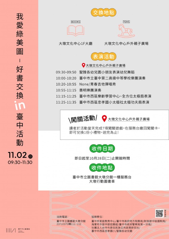 當日上午9時30分起舉辦精彩表演活動;參加交換活動之民眾,請於上午10時至11時30分至大墩文化中心1樓進行二手書及二手玩具交換事宜。 |