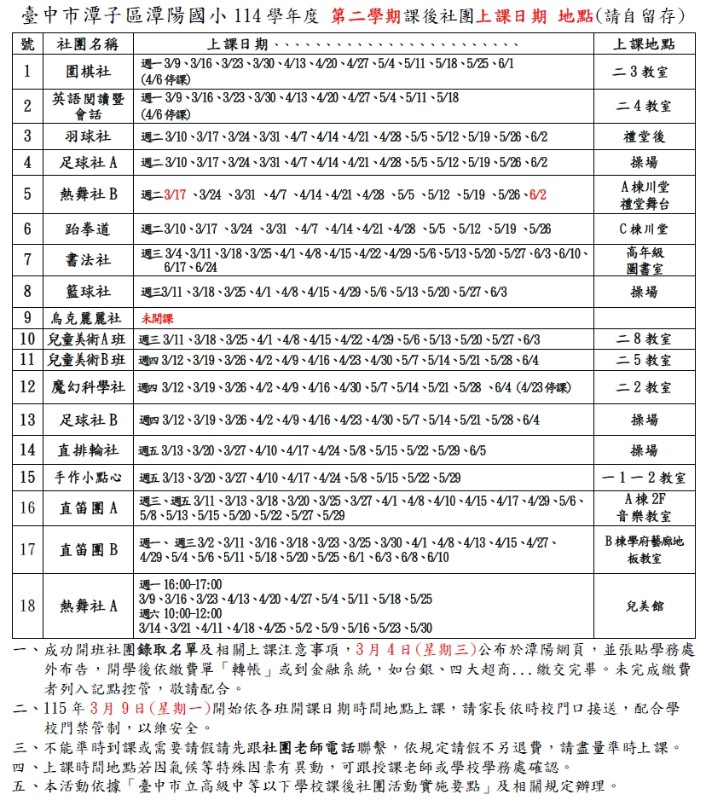 臺中市潭子區潭陽國小114學年度 第二學期課後社團開課一覽表