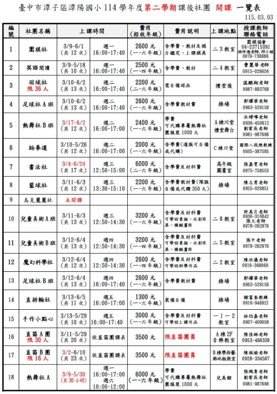 | 標題 | 更新 臺中市潭子區潭陽國小114學年度 第二學期課後社團開課一覽表 暨 錄取名單(含費用統計)2026.0306 |
