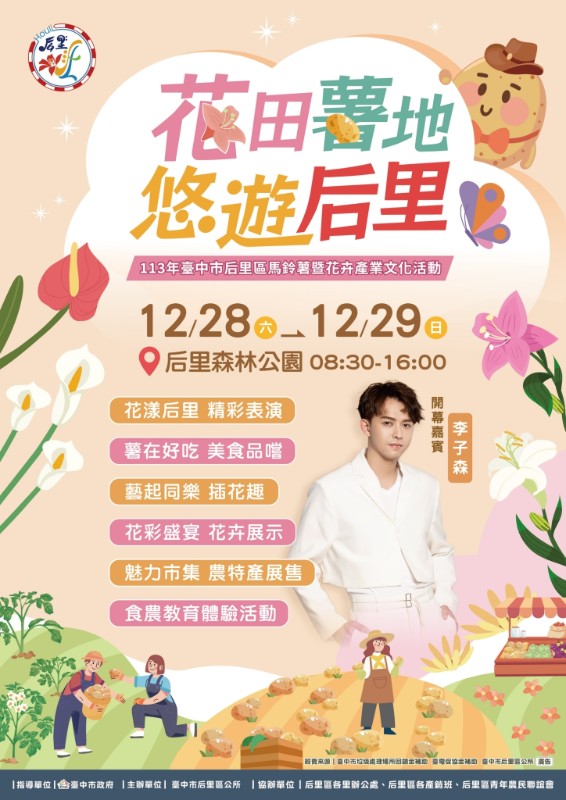 臺中市后里區公所辦理「113年臺中市后里區馬鈴薯暨花卉產業文化活動-花開后里 只薯藝你」,相關訊息如下。 說明: 一、 臺中市后里區公所訂於113年12月28、29日,假后里森林公園(臺中市后里區大山路)辦理「113年臺中市后里區馬鈴薯暨花卉產業文化活動-花田薯地 悠遊后里」,請惠予協助宣傳。 二、 為推廣本區蔬果、花卉產業,檢附旨揭活動DM電子檔,請放置貴單位網站、臉書協助宣傳。 三、 網站、臉書刊登內容如下: (一)、臺中市后里區公所訂於113年12月28、29日,假后里森林公園舉辦「113年臺中市后里區馬鈴薯暨花卉產業文化活動-花田薯地 悠遊后里」。 (二)、活動有花卉展示、農產品料理品嚐、農產品寓教於樂體驗活動、插花體驗、親子同樂、農特產品展售、優質表演團體接力演出【詳情請上后里區公所粉絲團搜尋「花田薯地 悠遊后里」】,活動豐富節目精彩,歡迎大家共襄盛舉。 四、 跑馬燈刊登內容如下:臺中市后里區公所訂於113年12月28、29日,假后里森林公園舉辦「113年臺中市后里區馬鈴薯暨花卉產業文化活動-花田薯地 悠遊后里」。詳情請上后里區公所粉絲團搜尋「花田薯地 悠遊后里」(https://www.facebook.com/taichunghouli)或進入活動粉絲團主頁https://www.facebook.com/profile.php?id=100084482530415。