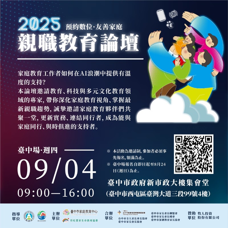 有關本中心舉辦「預約數位.友善家庭」2025親職教育論壇事宜,請協助宣傳並鼓勵所轄及民眾踴躍報名參加,請查照。 |
